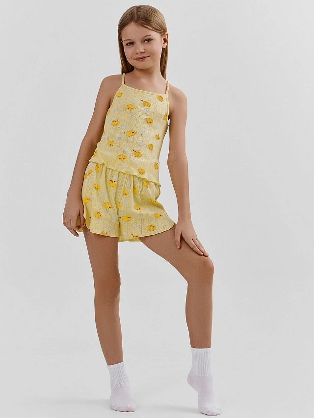 Домашняя пижама для девочек в ярком жёлтом цвете с весёлым принтом уточек — отличный выбор для тёплых дней и хорошего настроения. В комплект входят прилегающий топ на тонких бретелях и свободные шорты — удобно и для сна, и для игр дома.