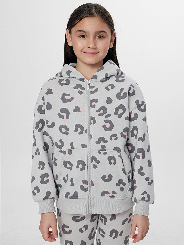 Серая толстовка на молнии с леопардовым принтом для девочек с мягким начесом внутри станет любимой вещью для прогулок и отдыха. Свободный крой и уютный капюшон дарят комфорт в течение всего дня. Удобная застежка-молния и практичный карман-кенгуру делают модель по-настоящему функциональной. Эластичные манжеты и пояс из рибаны бережно сохраняют тепло и обеспечивают идеальную посадку по фигуре.