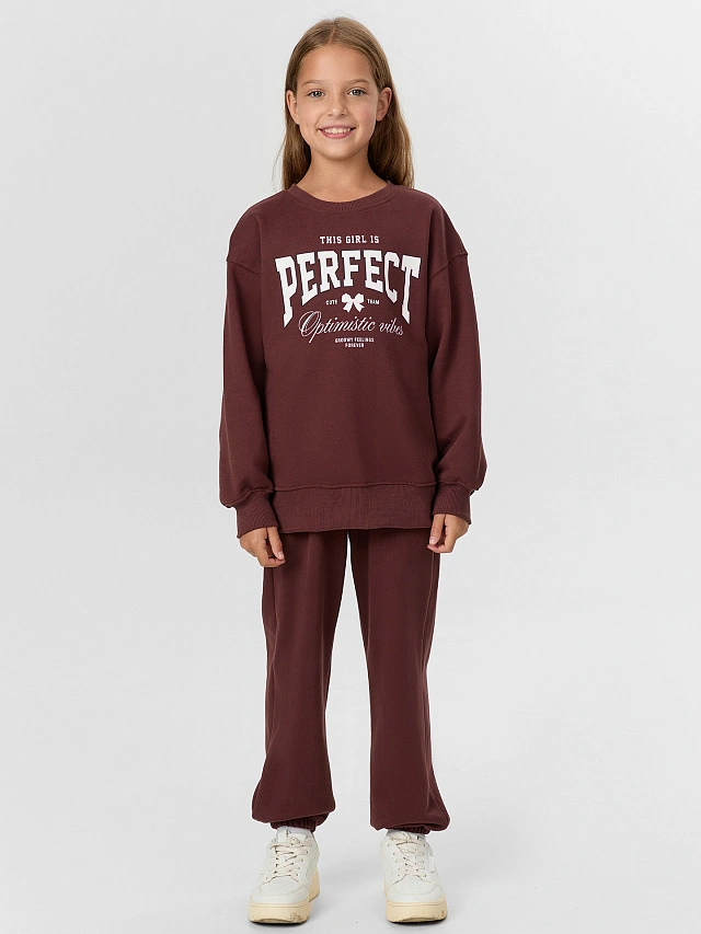 Комплект для девочек коричневый с надписью "This girl is perfect. Optimistic vibes." ("Эта девочка идеальна. Вайб оптимизма") — это уютный и стильный набор для повседневной носки. Комплект состоит из свободного джемпера и удобных брюк, выполненных из мягких дышащих материалов.