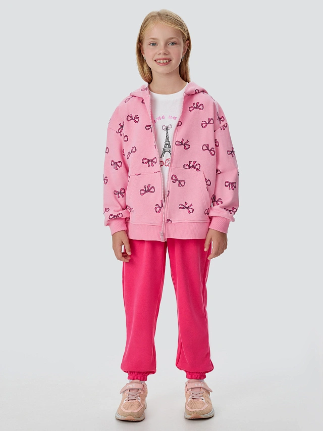 Футболка прямого кроя со спущенными плечами и короткими рукавами не сковывает движения. Круглая горловина и манжеты обработаны мягкой рибаной, предотвращающей натирание. Жакет на молнии с капюшоном и карманом-кенгуру защищает от ветра, а эластичные манжеты и пояс обеспечивают удобную посадку. Брюки с широким поясом на резинке и декоративными строчками дарят полную свободу для игр и спорта.