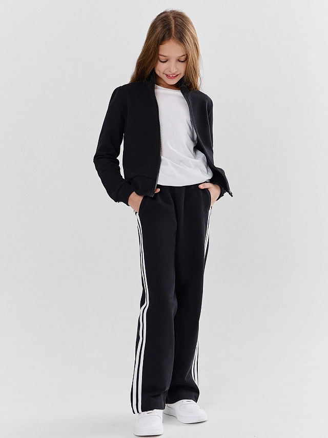 Черный спортивный комплект для девочек выглядит стильно и современно. Свободная толстовка с воротником-стойкой, застёжкой на молнию и длинными рукавами с манжетами. По рукавам и вдоль боковых швов брюк проходят контрастные лампасы — они добавляют динамику и делают образ более собранным.
