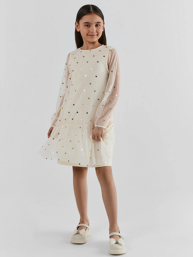 Нарядное платье для девочек — идеальный выбор для утренников, дней рождения и семейных праздников. Воздушный А-образный силуэт создаёт лёгкий, сказочный образ, а блестящие сердечки, рассыпанные по полупрозрачной сетке, добавляют волшебства и праздничного настроения. Объёмные длинные рукава с воланами делают модель ещё более нежной и торжественной.
