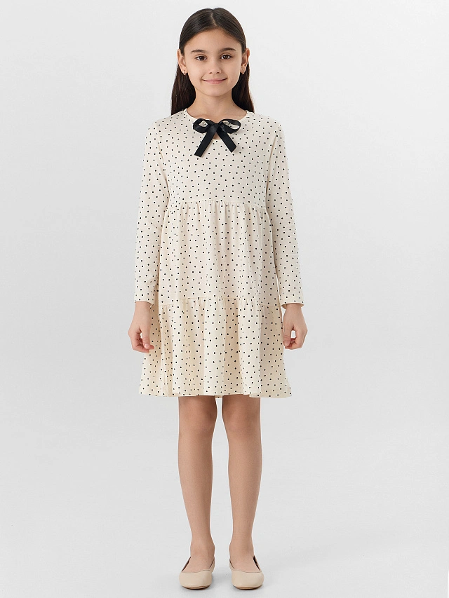 Платье для девочек бежевое с принтом в горошек