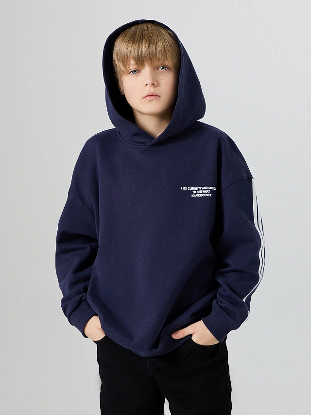 Худи насыщенного синего оттенка — для любознательных и отважных мальчиков, готовых к новым открытиям. Надпись «Я смешиваю любопытство и смелость, чтобы увидеть, что смогу открыть» превращает вещь во вдохновляющий девиз для каждого нового дня.