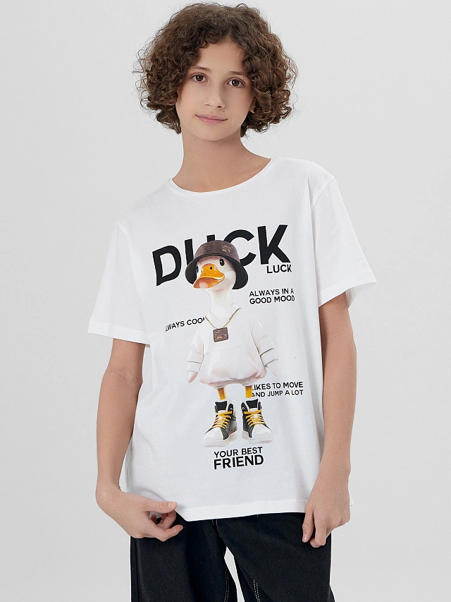Белая футболка для мальчиков с принтом утки и надписями «Утиная удача. Всегда в хорошем настроении. Всегда крут. Любит много двигаться и прыгать. Твой лучший друг» передает весёлый и жизнерадостный характер. Футболка выполнена из мягкого хлопка и имеет прямой свободный силуэт.
