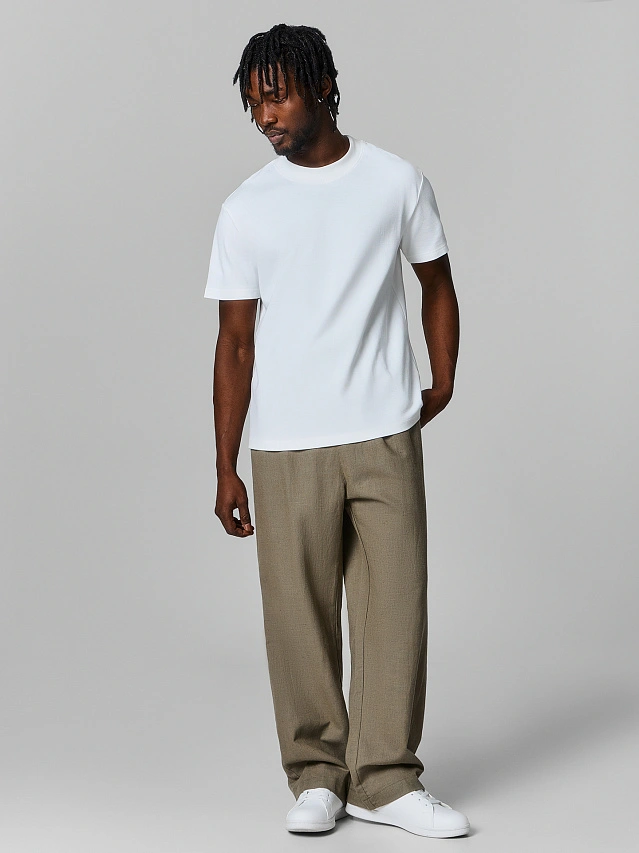 Брюки выполнены из смесовой ткани на основе льна и хлопка. Лён дарит материалу превосходную воздухопроницаемость, лёгкость и природную способность сохранять прохладу, а хлопок добавляет мягкость, гипоаллергенность и дополнительный комфорт. Такое сочетание делает брюки идеальными для тёплого сезона.