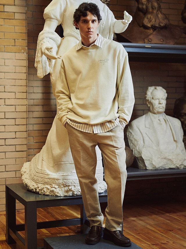 Свитшот изготовлен из хлопка и полиэстера. Хлопок обеспечивает натуральность и воздухопроницаемость, а полиэстер добавляет прочность и устойчивость к деформации. Универсальный бежевый цвет и лаконичный дизайн делают свитшот подходящим для сочетания с джинсами, брюками или шортами.