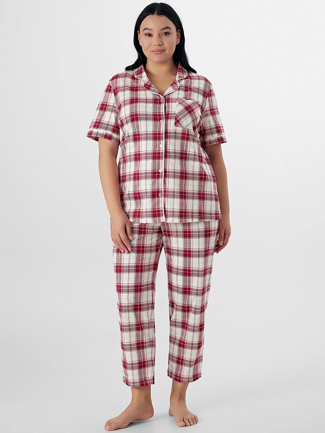 Домашний костюм в молочно-бордовую клетку — это элегантное решение для комфортного отдыха. Комплект, состоящий из прямого жакета и свободных бриджей, выполнен из натурального хлопка.