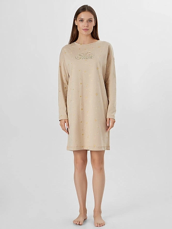 Женская пижама бежевого оттенка из хлопка с милой надписью "Время сиять" создана для комфортного отдыха. Комплект включает джемпер прямого силуэта и свободные бриджи, выполненные из мягкого натурального хлопка, приятного к телу и обеспечивающего идеальную воздухопроницаемость. Джемпер с круглой горловиной и короткими рукавами удобно садится по фигуре, а свободный крой брюк с эластичным поясом на тесьме гарантирует полную свободу движений во время сна.