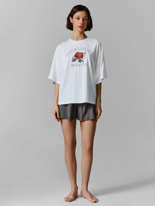 Домашний комплект с надписью «Сад роз. Шипы и лепестки». В этой фразе — лёгкая поэзия и намёк на то, что в каждом цветке есть не только красота, но и характер. Комплект состоит из свободного джемпера и коротких шорт А-силуэта.