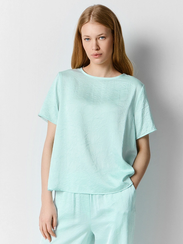 Эта блузка в нежном мятном оттенке — универсальное решение для тёплого сезона. Прямой силуэт, круглая горловина и короткие рукава создают лаконичный и элегантный образ. Застёжка на пуговицу на спинке добавляет аккуратную, изящную деталь, делая модель ещё более выразительной.