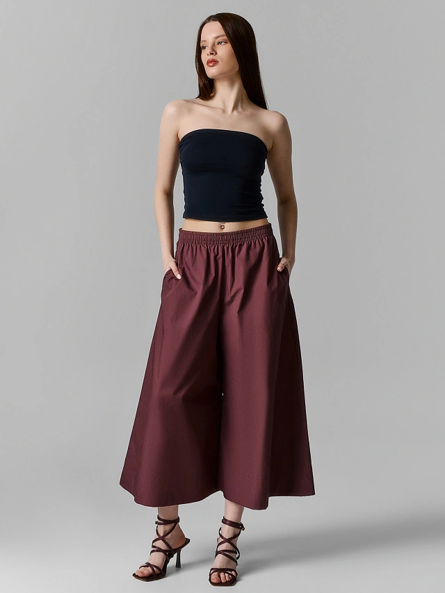 Брюки-кюлоты в благородном бордовом оттенке — удобный вариант для повседневных образов. Свободный расклешенный силуэт создаёт лёгкий, струящийся силуэт, который не сковывает движений и хорошо смотрится с разными видами обуви.