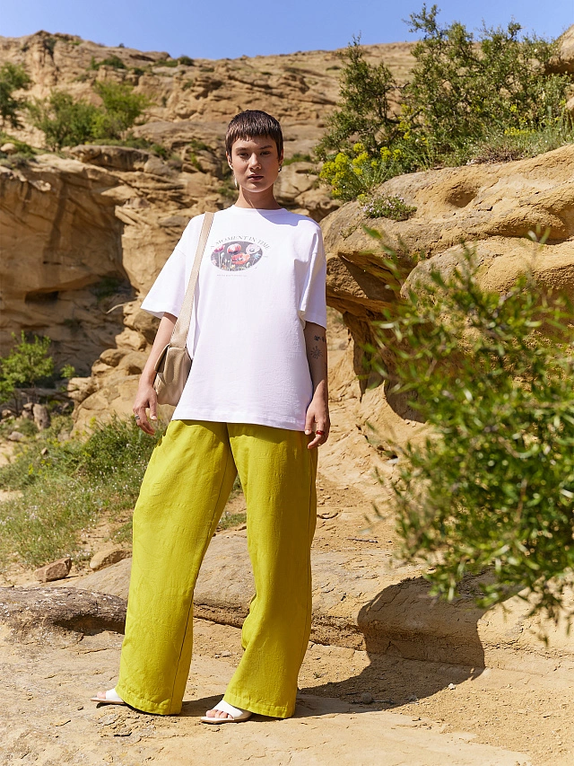 Хорошие брюки. Порадовал состав - обожаю лён. За счет принта не так сильно видна помятость. Хорошо смотрятся как с туфлями, так и с кроссовками. На рост 166 были длинноваты, пришлось укоротить