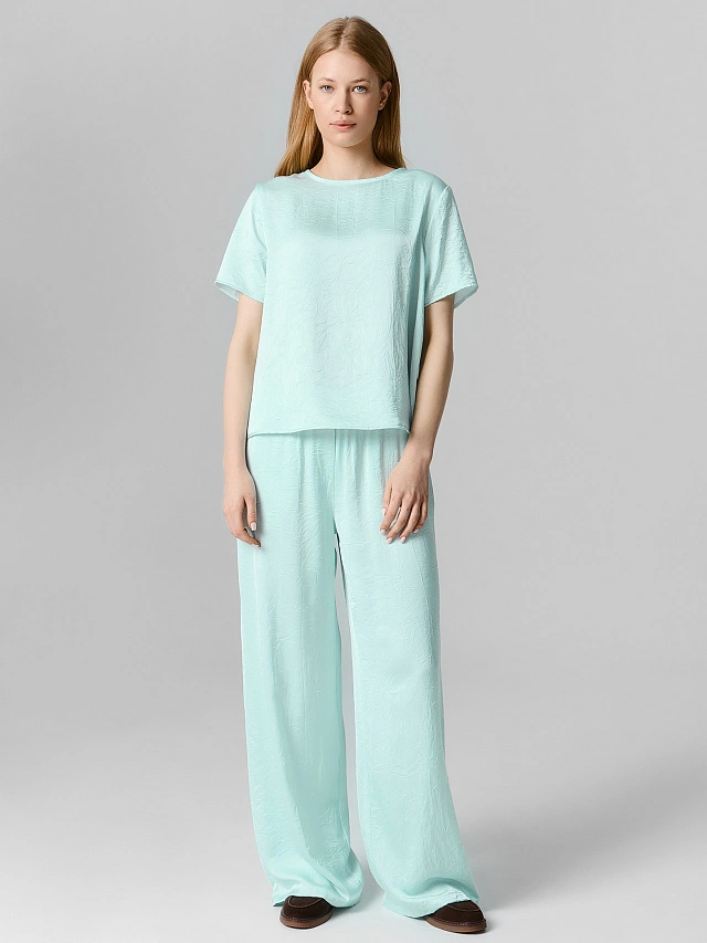 Прямые брюки в нежном мятном оттенке — универсальная основа для создания свежих и комфортных образов. Свободный силуэт со средней посадкой дарит ощущение лёгкости, а эластичный пояс обеспечивает комфортную посадку. Боковые карманы добавляют модели практичности, делая её идеальной для повседневной носки.