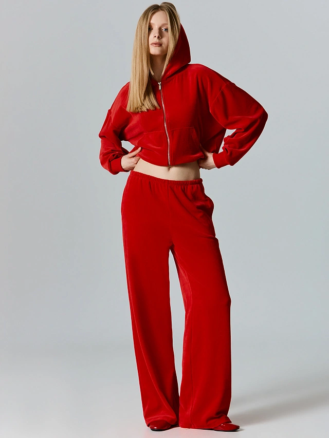Эти брюки в насыщенном красном оттенке из мягкого велюра — выбор для создания стильного и комфортного повседневного образа. Прямой силуэт и средняя посадка дарят свободу движений, делая модель идеальной для прогулок, встреч или занятий спортом. Велюровая фактура добавляет образу тактильную привлекательность и уютную сдержанность.