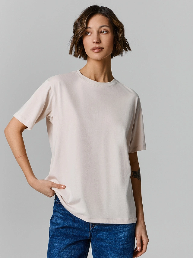 Футболка в благородном серо-льняном оттенке — выбор для ценителей сдержанной эстетики и естественного комфорта. Свободный силуэт из мягкого хлопка создаёт ощущение невесомости, а спущенная линия плеча и углублённая пройма дарят полную свободу движений. Широкие рукава чуть выше локтя и круглая горловина дополняют образ лаконичной, непринуждённой элегантностью.