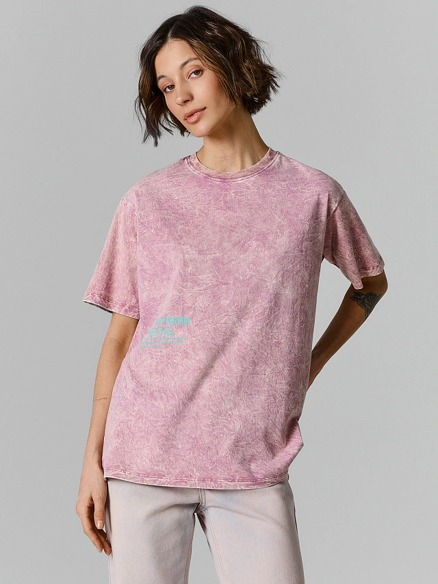 Обработка acid wash — это мягкое винтажное состаривание ткани, создающее эффект лёгких потёртостей и неравномерных разводов. Благодаря этой технике футболка выглядит так, будто хранит свою уникальную историю.