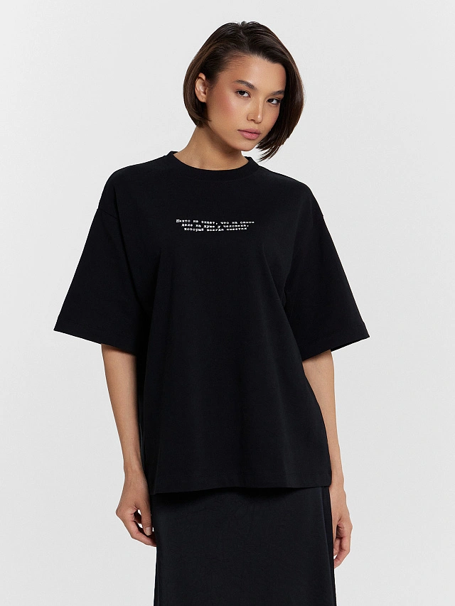Футболка черная с надписью ""никто не знает, что на самом деле на душе у человека, который всегда смеется"