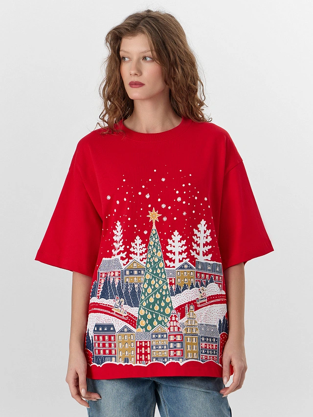 Красная футболка с новогодним принтом — идеальный выбор для создания праздничного настроения. Свободный оверсайз крой и спущенная линия плеча позволяют футболке мягко скользить по фигуре, не обтягивая ее, что дарит полную свободу движений. Короткие рукава и круглая горловина с отделкой из рибаны сохраняют мягкое, ненавязчивое касание к коже, обеспечивая удобство без давления.