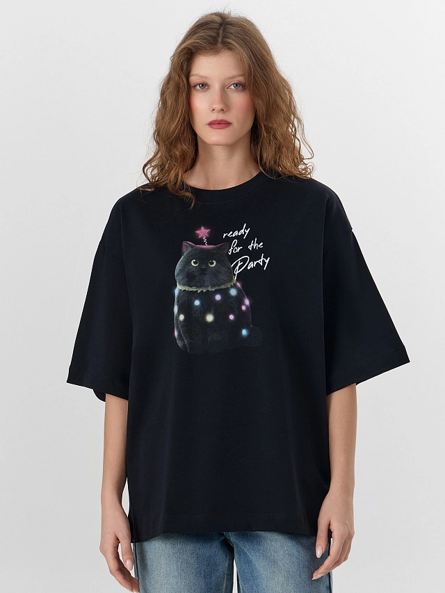 Черная футболка с принтом и надписью «Готова к вечеринке» создана для тех, кто любит встречать праздники стильно и с комфортом. Свободный оверсайз крой и мягкий хлопок делают эту модель идеальной для веселых вечеринок и уютных домашних посиделок.