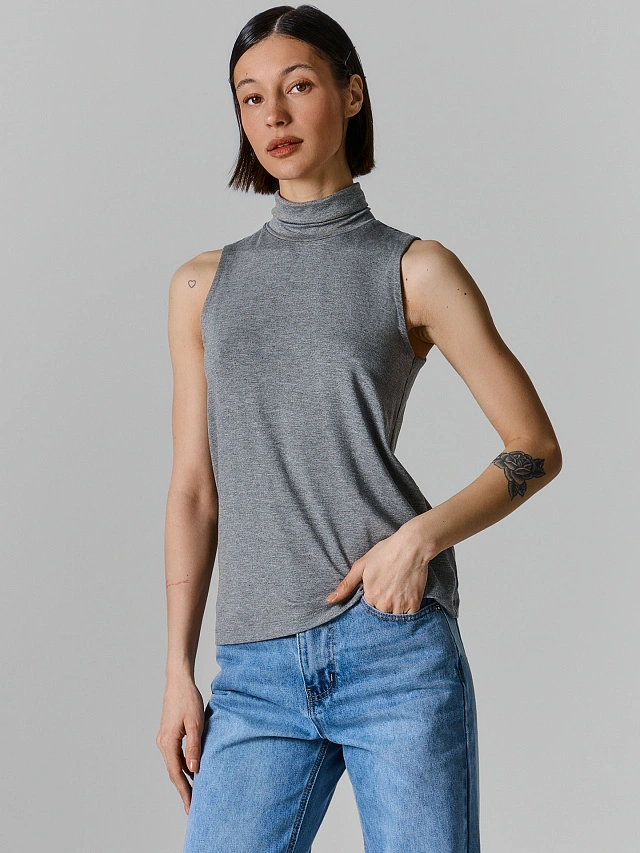 Серая блуза без рукавов — вещь, которая выручает в тёплую погоду и легко вписывается в повседневные образы. Прямой свободный силуэт не сковывает движений, аккуратная стойка вместо привычного воротника добавляет лаконичности и делает модель чуть строже. Проймы обработаны бейкой из той же ткани — край остаётся ровным и не растягивается со временем.