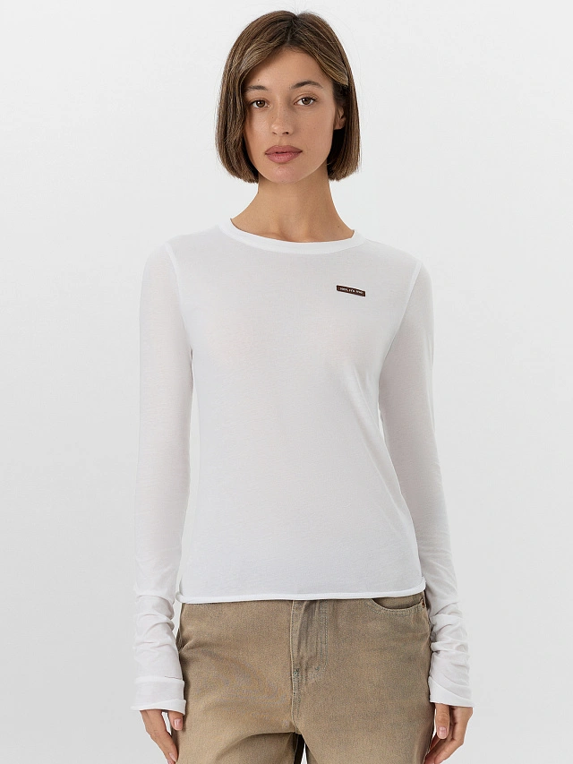 Белый женский лонгслив с надписью «Привет, это я» — это базовая модель для создания стильных повседневных образов. Лонгслив прилегающего силуэта выполнен из мягкой хлопковой кулирки. Плотность и структура хлопка оптимальны для повседневной носки: ткань устойчива к деформации, переносит частые стирки и сохраняет опрятный вид. Круглая горловина аккуратно обработана для сохранения формы. Длинные рукава и низ изделия оформлены модным «сырым» краем с двойной отделочной строчкой, что добавляет модели современный урбанистический шарм.
