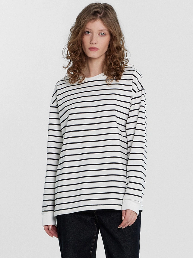 Полосатый лонгслив женский из высококачественного хлопка, свободного силуэта. Вырез круглый, рукава длинные на манжетах. Спущенная линия плеча и углубленные проймы дарят свободу движений. Отличный вариант для создания интересных образов. Тельняшка – это тренд уже несколько лет. За счет хорошей плотности материала, эта модель не просвечивает, а швы не натирают кожу. Лонгслив женский с длинным рукавом очень удобный и комфортный, с ним легко можно составить массу интересных аутфитов для городских будней. Если вам надоели привычные базовые свитшоты, этот базовый лонгслив — отличное решение! Дополнить джемпер женский оверсайз из хлопка можно стильным низом из линейки базовой одежды для женщин. Широкий размерный ряд и красивые расцветки, есть модели для девушек plus-size. Рекомендуем!