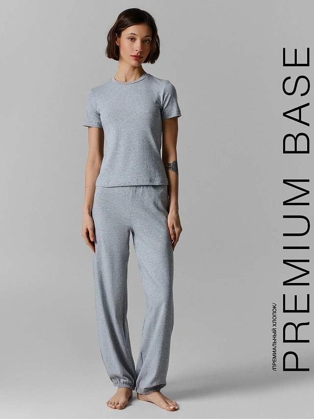 Серый комплект из коллекции Premium Base — это удобный набор на каждый день, в котором каждая вещь продумана до мелочей. В него входят прилегающий джемпер с коротким рукавом и свободные брюки-джоггеры. Вместе они создают образ, в котором одинаково комфортно и дома, и на прогулке, и в поездке.