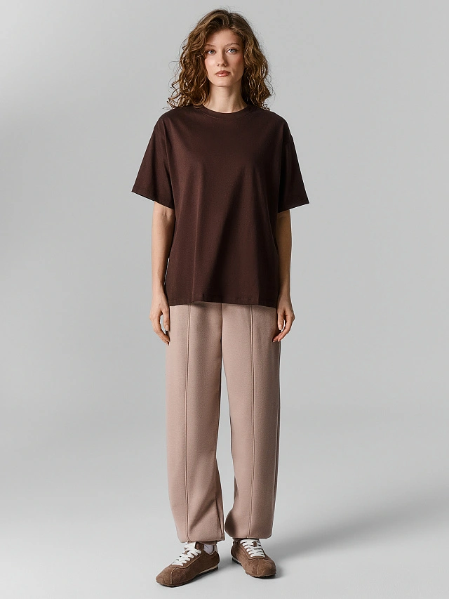 Спортивные брюки в коричневом оттенке — модель свободного силуэта. Они создают расслабленный, современный силуэт и при этом не сковывают движений. В таких брюках удобно и в городе, и за городом — для прогулок, встреч или спокойного отдыха.
