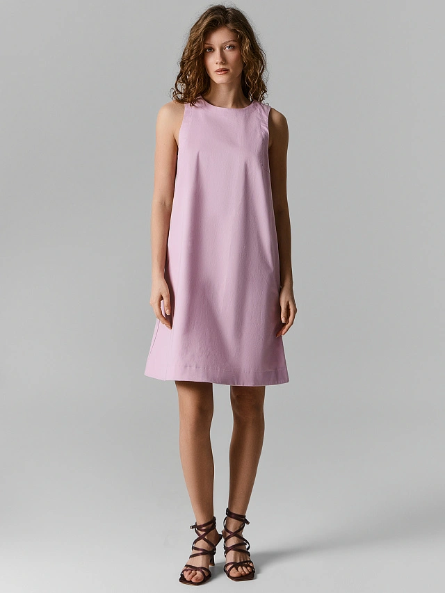 Розовый сарафан А-силуэта — легкий и удобный вариант для теплых дней. Свободный крой не сковывает движений, углубленные проймы добавляют комфорта, а мини-длина придает образу свежесть и игривость. Такое платье подойдет и для прогулок, и для встреч с друзьями, и для более нарядных выходов.