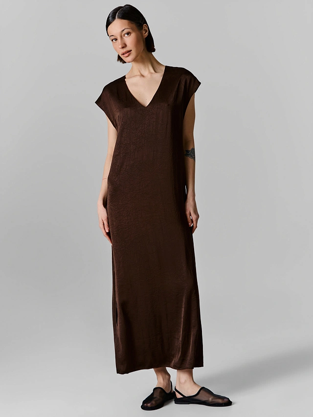 Платье макси в мягком коричневом оттенке — воплощение лаконичной элегантности и комфорта. Прямой свободный силуэт, V-образный вырез и рукава создают плавную линию плеча, мягко подчёркивая силуэт и обеспечивая свободу движений. Боковые разрезы добавляют лёгкость и делают модель ещё более удобной.