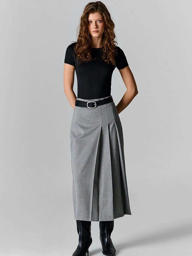 Эта юбка станет ключевым элементом базового гардероба. Она безупречно сочетается с классическими блузами, лаконичными топами, строгими жакетами или объёмными свитерами, позволяя создавать множество образов — от безупречно деловых до современных минималистичных.