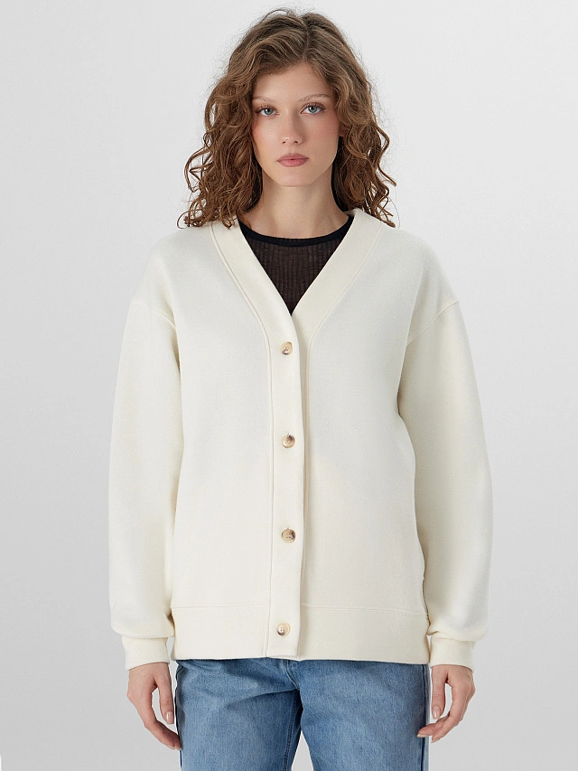 Молочный женский кардиган — это нежный акцент для прохладных дней. Он выполнен из мягкого селаника — трикотажа с лёгким ворсом, который сохраняет тепло и приятно облегает тело. Свободный прямой силуэт со спущенным плечом и V-образной горловиной создаёт элегантный и расслабленный вид.